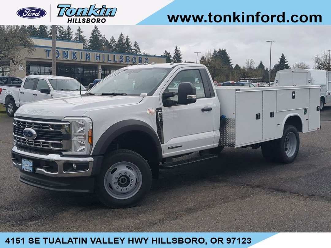 2024 Ford F-550SD XL DRW Oxford White4WD, 350 Amp Dual Alternators, 4 Speakers, 4.88 Axle Ratio, 4-Wheel Disc Brakes, 6-Ton Hydraulic Jack, ABS brakes, Air Conditioning, AM/FM radio, AM/FM Stereo w/MP3 Player, Brake assist, Bright Grille, Center High-Mounted Stop Lamp (CHMSL), Chrome Front Bumper, Compass, Delay-off headlights, Dual 68 AH/65 AGM Battery, Dual front impact airbags, Dual front side impact airbags, Dual rear wheels, Emergency communication system: SYNC 4 911 Assist, Engine Block Heater, Front anti-roll bar, Front Center Armrest w/Storage, Front License Plate Bracket, Front reading lights, Fully automatic headlights, GVWR: 18,000 lbs Payload Package, GVWR: 19,500 lb Payload Plus Upgrade Package, Halogen Fog Lamps, HD Vinyl 40/20/40 Split Bench Seat, Heated door mirrors, High Capacity Trailer Tow Package, Illuminated entry, Limited Slip w/4.30 Axle Ratio, Order Code 660A, Outside temperature display, Overhead airbag, Overhead console, Panic alarm, Passenger cancellable airbag, Passenger vanity mirror, Platform Running Boards, Power door mirrors, Power steering, Power windows, Rear anti-roll bar, Rear View Camera & Prep Kit, Remote keyless entry, Remote Start, Snow Plow Prep Package, Speed control, Steering wheel mounted audio controls, SYNC 4 Communications & Entertainment System, Tachometer, Telescoping steering wheel, Tilt steering wheel, Traction control, Trip computer, Turn signal indicator mirrors, Variably intermittent wipers, Wheels: 19.5" x 6" Argent Painted Steel, XL Chrome Package, 4WD.Power Stroke 6.7L V8 DI 32V OHV Turbodiesel 4WD 10-Speed AutomaticKNAPHEIDE 11' SERVICE BODY, DRIVER AND PASSENGER SIDE DOUBLE VERTICAL CABINETS, DRIVER AND PASSENGER SIDE HORIZONTAL CABINETS, DRIVER AND PASSENGER SIDE REAR VERTICAL CABINETS, RHINO LINED REAR STEP BUMPER, CLASS 5 RECEIVER HITCH, REAR DROP DOWN GATE, MASTER CABINET LOCKS.