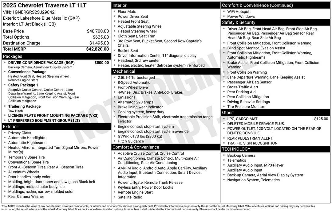 Price includes all available non-conditional rebates: $1000 - Chevrolet Bonus Cash. Exp. 03/02/2026 Factory MSRP: $42,8203rd row seats: split-bench, 4-Way Manual Front Passenger Seat Adjuster, 4-Wheel Disc Brakes, 6 Speakers, 6-Speaker Audio System Feature, 8-Way Power Driver Seat Adjuster, ABS brakes, Air Conditioning, Alloy wheels, AM/FM radio: SiriusXM with 360L, Apple CarPlay/Android Auto, Auto High-beam Headlights, Automatic temperature control, Brake assist, Bumpers: body-color, Cargo Mat, Child-Seat-Sensing Airbag, Compass, Delay-off headlights, Deleted Mobile Service Plus, Driver Confidence Package, Driver door bin, Driver vanity mirror, Dual front impact airbags, Dual front side impact airbags, Electronic Stability Control, Emergency communication system: OnStar, Four wheel independent suspension, Front anti-roll bar, Front Bucket Seats, Front Center Armrest, Front dual zone A/C, Front reading lights, Fully automatic headlights, HD Surround Vision, Heated door mirrors, Heated front seats, Heated steering wheel, Illuminated entry, Low tire pressure warning, Navigation System, Occupant sensing airbag, Outside temperature display, Overhead airbag, Overhead console, Panic alarm, Passenger door bin, Passenger vanity mirror, Power door mirrors, Power driver seat, Power Liftgate, Power Outlet, Power steering, Power windows, Preferred Equipment Group 1LT, Premium Cloth Seat Trim, Radio data system, Radio: : Audio System w/17.7" Diagonal Display, Rear air conditioning, Rear anti-roll bar, Rear Pedestrian Alert, Rear reading lights, Rear window defroster, Rear window wiper, Remote keyless entry, Security system, SiriusXM with 360L Trial Subscription, Speed control, Speed-sensing steering, Spoiler, Steering wheel mounted audio controls, Tachometer, Telescoping steering wheel, Tilt steering wheel, Traction control, Traffic Sign Recognition, Trip computer, Turn signal indicator mirrors, Variably intermittent wipers, Voltmeter, Wheels: 18" Grazen Metallic Machined-Face Aluminum.2025 Chevrolet LT Traverse Lakeshore Blue Metallic4D Sport Utility 8-Speed Automatic 2.5L DOHC FWD