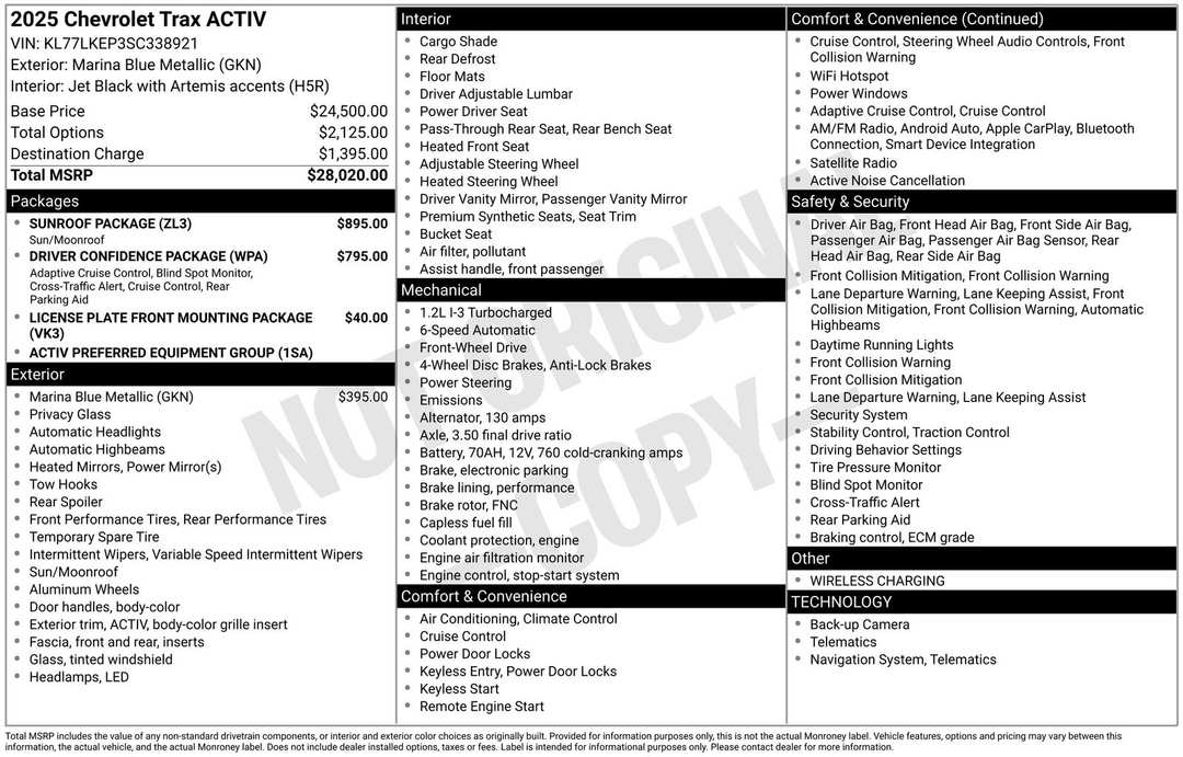 Price includes all available non-conditional rebates: $500 - Chevrolet GM Financial APR & NCC Consumer Cash Program: $500 discount and 5.69% APR for 36 months. $30.28 per $1000 financed. Available to well qualified buyers who finance through GM Financial. XGQ, NCC. Exp. 03/02/2026 This rebate is only available if you also take the 'Chevrolet GM Financial APR & NCC Consumer Cash Program: $500 discount and 5.69% APR for 36 months' rebate. $500 - Chevrolet GMF Bonus Cash Program. Exp. 03/02/2026 Factory MSRP: $27,9802-Way Adjustable Front Head Restraints, 2-Way Power Driver Lumbar Seat Adjuster, 3.50 Final Drive Axle Ratio, 4-Way Manual Front Passenger Seat Adjuster, 4-Wheel Disc Brakes, 6 Speakers, 6-Speaker Audio System Feature, 8-Way Power Driver Seat Adjuster, ABS brakes, Adaptive Cruise Control, Air Conditioning, Alloy wheels, AM/FM radio: SiriusXM, Auto High-beam Headlights, Automatic temperature control, Brake assist, Bumpers: body-color, Compass, Delay-off headlights, Driver Confidence Package, Driver door bin, Driver vanity mirror, Dual front impact airbags, Dual front side impact airbags, Electronic Stability Control, Emergency communication system: OnStar One Essentials, Evotex Seat Trim, Exterior Parking Camera Rear, Front anti-roll bar, Front Bucket Seats, Front Center Armrest, Front reading lights, Front wheel independent suspension, Fully automatic headlights, Heated door mirrors, Heated Driver and Front Passenger Seats, Heated front seats, Heated steering wheel, Illuminated entry, Lane Change Alert with Side Blind Zone Alert, Leather steering wheel, License Plate Front Mounting Package, Low tire pressure warning, Occupant sensing airbag, Outside temperature display, Overhead airbag, Overhead console, Panic alarm, Passenger door bin, Passenger vanity mirror, Power door mirrors, Power driver seat, Power Sliding Glass Sunroof with Manual Shade, Power steering, Power windows, Preferred Equipment Group 1SA, Premium audio system: Chevrolet Infotainment 3, Radio data system, Radio: AM/FM Stereo Audio System, Rear Cross-Traffic Alert, Rear Park Assist, Rear window defroster, Rear window wiper, Remote keyless entry, Security system, SiriusXM Trial Subscription, Speed control, Split folding rear seat, Spoiler, Steering wheel mounted audio controls, Sunroof Package, Tachometer, Telescoping steering wheel, Tilt steering wheel, Traction control, Trip computer, Variably intermittent wipers, Wheels: 18" Black-Painted Aluminum, Wireless Charging.2025 Chevrolet ACTIV Trax Marina Blue Metallic4D Sport Utility 6-Speed Automatic 1.2L I3 DI Turbocharged DOHC 12V LEV3-ULEV70 137hp FWD