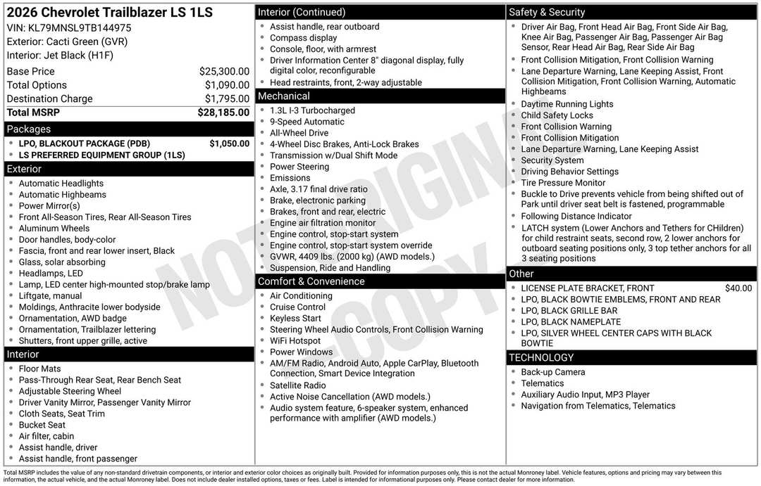 Price includes all available non-conditional rebates: $500 - Chevrolet Bonus Cash. Exp. 03/02/2026 Factory MSRP: $27,9051 Type-A and 1 Type-C USB Ports, 3.17 Final Drive Axle Ratio, 4-Way Manual Front Passenger Seat Adjuster, 4-Wheel Disc Brakes, 6 Speakers, 6-Speaker Audio System Feature with Amplifier, 6-Way Manual Driver Seat Adjuster, ABS brakes, Air Conditioning, Alloy wheels, AM/FM radio: SiriusXM, Auto High-beam Headlights, Black Grille Bar, Black Nameplate, Blackout Package, Brake assist, Bumpers: body-color, Cloth Seat Trim, Compass, Delay-off headlights, Driver door bin, Driver vanity mirror, Dual front impact airbags, Dual front side impact airbags, Electronic Stability Control, Emergency communication system: OnStar and Chevrolet connected services capable, Exterior Parking Camera Rear, Flat-Folding Front Passenger Seatback, Front and Rear Black Bowtie Emblems, Front anti-roll bar, Front Bucket Seats, Front Center Armrest, Front License Plate Bracket, Front reading lights, Front wheel independent suspension, Fully automatic headlights, Illuminated entry, Knee airbag, Low tire pressure warning, Occupant sensing airbag, Overhead airbag, Overhead console, Panic alarm, Passenger door bin, Passenger vanity mirror, Power door mirrors, Power steering, Power windows, Preferred Equipment Group 1LS, Radio data system, Radio: AM/FM Stereo Audio System, Rear side impact airbag, Rear window defroster, Rear window wiper, Remote keyless entry, Ride and Handling Suspension, Security system, Silver Wheel Center Caps with Black Bowtie, SiriusXM Trial Subscription, Speed control, Split folding rear seat, Spoiler, Steering wheel mounted audio controls, Tachometer, Telescoping steering wheel, Tilt steering wheel, Traction control, Trip computer, Variably intermittent wipers, Wheels: 17" Silver-Painted Aluminum, Wireless Apple CarPlay/Android Auto.2026 Chevrolet LS TrailBlazer Cacti Green4D Sport Utility 9-Speed Automatic 1.3L I3 Turbocharged DOHC 12V LEV3-SULEV30 155hp AWD