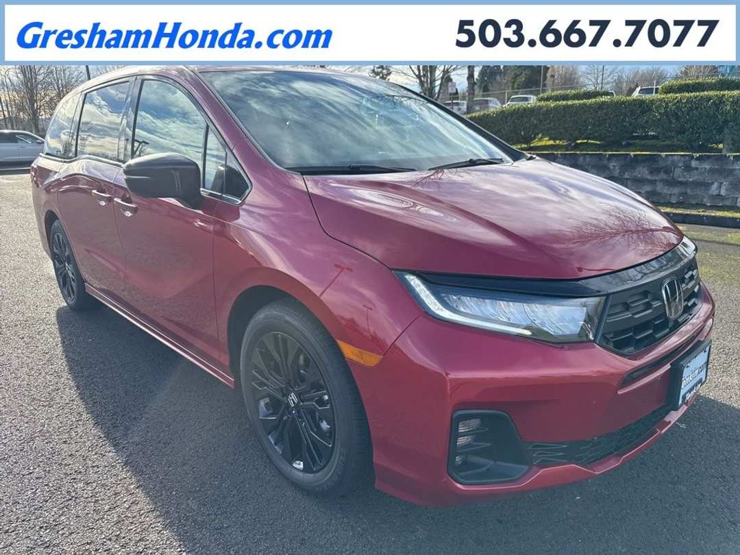 Please Note this price does not include any dealer added accessories. This vehicle is located at Tonkin Gresham Honda Please call to learn more! . 2026 Honda Odyssey Sport-L 4D Passenger Van 3.5L V6 SOHC i-VTEC 24V 10-Speed Automatic FWD Radiant Red Metallic II 3rd row seats: split-bench, 4-Wheel Disc Brakes, 7 Speakers, ABS brakes, Adaptive Cruise Control: Adaptive Cruise Control (ACC) with Low-Speed Follow, Air Conditioning, Alloy wheels, AM/FM radio: SiriusXM, Anti-whiplash front head restraints, Apple CarPlay/Android Auto, Auto High-beam Headlights, Auto-dimming Rear-View mirror, Automatic temperature control, Blind Spot Information (BSI) System warning, Body Colored Door Edge Guards, Brake assist, Bumpers: body-color, Delay-off headlights, Driver door bin, Driver vanity mirror, Driver's Seat Mounted Armrest, Dual front impact airbags, Dual front side impact airbags, Electronic Stability Control, Exterior Parking Camera Rear, Four wheel independent suspension, Front anti-roll bar, Front Bucket Seats, Front dual zone A/C, Front fog lights, Front reading lights, Fully automatic headlights, Garage door transmitter: HomeLink, Heated door mirrors, Heated Front Bucket Seats, Heated front seats, Illuminated entry, Knee airbag, Lane departure: Lane Keeping Assist System (LKAS) active, Leather steering wheel, Leather-Trimmed Seats, Low tire pressure warning, Memory seat, Occupant sensing airbag, Outside temperature display, Overhead airbag, Overhead console, Panic alarm, Passenger door bin, Passenger seat mounted armrest, Passenger vanity mirror, Power door mirrors, Power driver seat, Power Liftgate, Power moonroof, Power passenger seat, Power steering, Power windows, Radio data system, Radio: 160-Watt AM/FM/HD/SiriusXM Audio System, Rear air conditioning, Rear anti-roll bar, Rear reading lights, Rear seat center armrest, Rear window defroster, Rear window wiper, Reclining 3rd row seat, Remote keyless entry, Security system, Speed control, Speed-sensing steering, Speed-Sensitive Wipers, Split folding rear seat, Spoiler, Steering wheel mounted audio controls, Tachometer, Telescoping steering wheel, Tilt steering wheel, Traction control, Trip computer, Turn signal indicator mirrors, Variably intermittent wipers, Wheels: 19" Gloss Black Alloy.