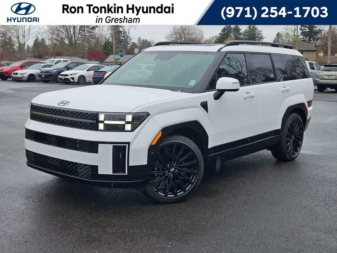 2026 Hyundai Santa Fe Calligraphy 2.5L I4 8-Speed Automatic with SHIFTRONIC AWD 4D Sport Utility Serenity White AWD, Black Leather, 12 Speakers, 3rd row seats: bench, 4-Wheel Disc Brakes, ABS brakes, Air Conditioning, Alloy wheels, AM/FM radio: SiriusXM, Apple CarPlay & Android Auto, Auto High-beam Headlights, Auto-dimming Rear-View mirror, Automatic temperature control, Brake assist, Bumpers: body-color, Cargo Net, Cargo Tray, Carpeted Floor Mats, Delay-off headlights, Driver door bin, Driver vanity mirror, Dual front impact airbags, Dual front side impact airbags, Electronic Stability Control, Emergency communication system, Exterior Parking Camera Rear, First Aid Kit, Four wheel independent suspension, Front anti-roll bar, Front Bucket Seats, Front Center Armrest, Front dual zone A/C, Front reading lights, Fully automatic headlights, Garage door transmitter: HomeLink, Heads-Up Display, Heated and Ventilated Front Bucket Seats, Heated door mirrors, Heated front seats, Heated rear seats, Heated steering wheel, Illuminated entry, Knee airbag, Leather steering wheel, Low tire pressure warning, Memory seat, Navigation System, Occupant sensing airbag, Option Group 01, Outside temperature display, Overhead airbag, Overhead console, Panic alarm, Passenger door bin, Passenger vanity mirror, Power door mirrors, Power driver seat, Power Liftgate, Power moonroof, Power passenger seat, Power steering, Power windows, Quilted Premium Nappa Leather Seat Trim, Radio: AM/FM/HD Bose Premium Audio System, Rain sensing wipers, Rear anti-roll bar, Rear side impact airbag, Rear window defroster, Rear window wiper, Remote keyless entry, Roadside Assistance Kit, Roof Rack Crossbars, Security system, Speed control, Speed-sensing steering, Split folding rear seat, Spoiler, Steering wheel mounted audio controls, Tachometer, Telescoping steering wheel, Tilt steering wheel, Traction control, Trip computer, Turn signal indicator mirrors, Variably intermittent wipers, Ventilated front seats, Wheels: 21" x 8.5J Unique Dark Finish Alloy, AWD, Black Leather. Call for availability. Come in to Ron Tonkin Gresham Hyundai to test drive today! DA2028 View our entire inventory at https://www.rontonkinhyundai.com/ Pricing includes all applicable factory rebates, and discounts, buyer must finance through HMFA on approved credit. Price excludes tax, title, license, doc fee and dealer added accessories. Price includes: $1700 - Retail Bonus Cash. Exp. 04/30/2026