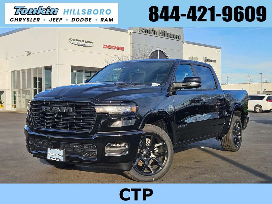2026 Ram 1500 Laramie Diamond Black Crystal Pearlcoat HEMI 5.7L V8 Multi Displacement VVT eTorque 4WD 8-Speed Automatic10 Speakers, 14.4" Touchscreen Display, 4-Wheel Disc Brakes, 4G LTE Wi-Fi Hot Spot, ABS brakes, Accent Color Door Handles, Accent Color Premium Power Mirrors, Accent Color Tailgate Handle, Active Noise Control System, Air Conditioning, Alloy wheels, AM/FM radio: SiriusXM with 360L, Anti-Spin Differential Rear Axle, Apple CarPlay/Android Auto, Audio memory, Auto High-beam Headlights, Auto Power-Folding Mirrors, Auto-dimming door mirrors, Auto-Dimming Exterior Driver Mirror, Auto-dimming Rear-View mirror, Automatic temperature control, Black Exterior Truck Badging, Black Headlamp Bezels, Black Interior Accents, Black Painted Exterior Mirrors Caps, Black Tail Lamp Bezels, Body Color Front Bumper, Body Color Rear Bumper with Step Pads, Brake assist, Bumpers: chrome, Chrome Exterior Mirrors, Cluster 12" TFT Color Display, Compass, Connected Travel and Traffic Services, Connectivity - US/Canada, Convex Wide-Angle Exterior Mirror Insert, Delay-off headlights, Dome Dual LED Reading Lamp, Driver door bin, Driver vanity mirror, Dual Exhaust with Black Tips, Dual front impact airbags, Dual front side impact airbags, Dual-Pane Panoramic Sunroof, Electronic Stability Control, Exterior Mirrors Approach Lamps, Exterior Mirrors Courtesy Lamps, Exterior Mirrors with Heating Element, Exterior Mirrors with Memory, Exterior Mirrors with Supplemental Signals, Front anti-roll bar, Front Bucket Seats, Front Center Armrest w/Storage, Front dual zone A/C, Front fog lights, Front License Plate Bracket, Front Passenger Interactive Display, Front reading lights, Front wheel independent suspension, Fully automatic headlights, Garage door transmitter, GPS Navigation, Grille Surround 3 Black Texture 2 Black, Harman/Kardon 19 Speaker Premium Sound, Heated door mirrors, Heated front seats, Heated rear seats, Heated steering wheel, Illuminated entry, Integrated Center Stack Radio, Integrated Voice Command with Bluetooth, Laramie Level 2 Equipment Group, Leather steering wheel, Leather Trimmed Bucket Seats, LED Dome/Reading Lamp, Low tire pressure warning, Memory seat, MOPAR Front and Rear Rubber Floor Mats, MyFlexCare Service Plan, Navigation System, Night Edition, Occupant sensing airbag, Off-Road Information Pages, Outside temperature display, Overhead airbag, Overhead console, Panic alarm, ParkView Rear Back-Up Camera, Passenger door bin, Passenger vanity mirror, Pirelli Brand Tires, Power door mirrors, Power driver seat, Power passenger seat, Power steering, Power Tailgate, Power windows, Proximity Approach/Departure Lamps, Quick Order Package 27H Laramie, Radio data system, Radio: Uconnect 5 Nav with 14.4" Display, Radio: Uconnect 5 Navigation with 12.0" Display, Rain Sensitive Windshield Wipers, RAM Grille Badge - Black, RAM Grille Badge - Chrome, Rear anti-roll bar, Rear reading lights, Rear seat center armrest, Rear step bumper, Remote keyless entry, Security system, SiriusXM Radio Service, SiriusXM with 360L, Speed control, Split folding rear seat, Sport Performance Hood, Steering wheel mounted audio controls, Tachometer, Telescoping steering wheel, Tilt steering wheel, Traction control, Trailer Brake Control, Trip computer, Turn signal indicator mirrors, USB Host Flip, Variably intermittent wipers, Ventilated front seats, Voltmeter, Wheels: 20" x 9" Premium Paint/Polish, Wheels: 22" x 9" Forged Aluminum. Price includes: $1000 - 2026 National Bonus Cash . Exp. 03/31/2026 $3500 - 2026 National Retail Bonus Cash . Exp. 03/31/2026