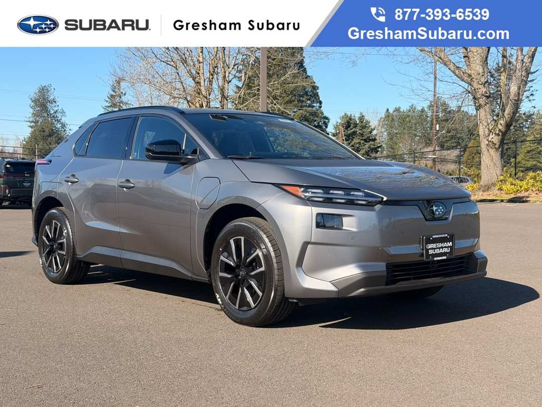 4-Wheel Disc Brakes, 6 Speakers, ABS brakes, Air Conditioning, Alloy wheels, AM/FM radio: SiriusXM, Apple CarPlay & Android Auto, Auto High-beam Headlights, Auto-dimming Rear-View mirror, Automatic temperature control, Brake assist, Bumpers: body-color, Driver door bin, Driver vanity mirror, Dual front impact airbags, Dual front side impact airbags, Electronic Stability Control, Emergency communication system, Exterior Parking Camera Rear, Four wheel independent suspension, Front anti-roll bar, Front Bucket Seats, Front Center Armrest, Front dual zone A/C, Front reading lights, Fully automatic headlights, Garage door transmitter: HomeLink, Headlight cleaning, Heated door mirrors, Heated Front Bucket Seats, Heated front seats, Illuminated entry, Knee airbag, Leather steering wheel, Low tire pressure warning, Navigation System, Occupant sensing airbag, Outside temperature display, Overhead airbag, Overhead console, Panic alarm, Passenger door bin, Passenger vanity mirror, Power door mirrors, Power driver seat, Power Liftgate, Power steering, Power windows, Radio data system, Radio: : Subaru 14" Multimedia System, Rain sensing wipers, Rear anti-roll bar, Rear reading lights, Rear seat center armrest, Rear window defroster, Remote keyless entry, Security system, Speed control, Speed-sensing steering, Split folding rear seat, Spoiler, StarTex Upholstery, Steering wheel mounted audio controls, Telescoping steering wheel, Tilt steering wheel, Traction control, Trip computer, Turn signal indicator mirrors, Variably intermittent wipers, Wheels: : 18" x 7.5" J Aluminum-Alloy. Recent Arrival! 2026 Subaru Solterra Premium 4D Sport Utility 1-Speed Automatic Electric Motor AWD CarbonVisit Gresham Subaru online at www.GreshamSubaru.com and see why we service Portland and Vancouver as The BIG Subaru Store with the SMALL Prices!!!