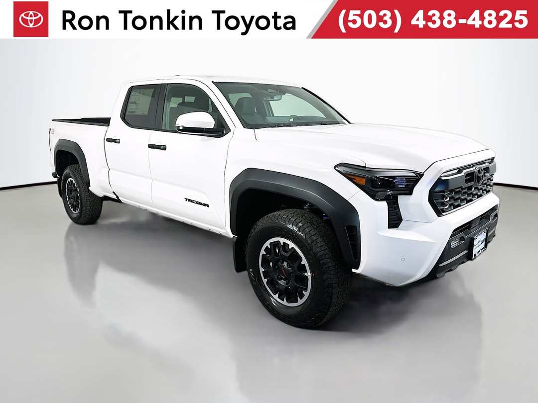 2026 Toyota Tacoma 2.4L 4-Cylinder 8-Speed Automatic 4WD TRD Off-Road 4D Double Cab White 120V/400W AC Power Inverter, 18" Wheels, 3.583 Axle Ratio, 4-Wheel Disc Brakes, 6 Speakers, ABS brakes, Air Conditioning, Alloy wheels, AM/FM radio: SiriusXM, Anti-whiplash front head restraints, Apple CarPlay/Android Auto, Auto High-beam Headlights, Auto-dimming Rear-View mirror, Automatic temperature control, Bed Step, Black Tailgate Insert, Brake assist, Bumpers: body-color, Door Panel Scuff Protector, Driver door bin, Driver vanity mirror, Dual front impact airbags, Dual front side impact airbags, Electronic Stability Control, Emergency communication system: Safety Connect (up to 10-year trial subscription), Exterior Parking Camera Rear, Fabric Seat Trim, Four wheel independent suspension, Front anti-roll bar, Front Bucket Seats, Front Center Armrest, Front fog lights, Front reading lights, Fully automatic headlights, Heated door mirrors, Illuminated entry, Integrated Trailer Brake Controller, JBL Premium Audio, Knee airbag, Leather Shift Knob, Leather steering wheel, Long Bed with Inverter, Low tire pressure warning, Moon Roof, Mudguards, Multimedia Glass Screen Protector, Occupant sensing airbag, Outside temperature display, Overhead airbag, Overhead console, Panic alarm, Passenger door bin, Passenger vanity mirror, Power door mirrors, Power Horizontal Rear Window, Power steering, Power windows, Pre-Wire Accommodation (bed Power Port), Radio: 8" Toyota Audio Multimedia, Rear step bumper, Rear window defroster, Remote keyless entry, Security system, Smart Key w/Digital Key Technology, SofTex Seat Trim, Speed control, Speed-sensing steering, Split folding rear seat, Spray-on Bed Liner, Steering wheel mounted audio controls, Tachometer, Telescoping steering wheel, Tilt steering wheel, Traction control, TRD Off Road Upgrade Package, Trip computer, Turn signal indicator mirrors, Variably intermittent wipers. 19/23 City/Highway MPGSome factory rebates may require factory financing, some special finance or lease rates are in lieu of factory rebates of specific make or model vehicles. Tax, title, licensing, documentation fee of $200, and dealer installed accessories are not included. Prices not available for Fleet or Commercial business's. Please confirm the accuracy of the included equipment by calling us prior to purchase. Price does not include Tax, Title, and License.