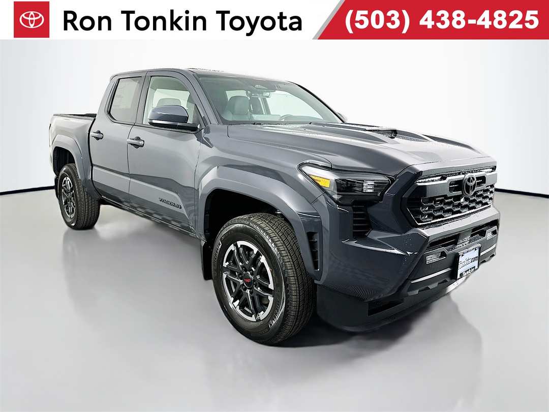 Recent Arrival! 2026 Toyota Tacoma 2.4L 4-Cylinder 8-Speed Automatic 4WD TRD Sport 4D Double Cab Dark Gray 3.583 Axle Ratio, 4-Wheel Disc Brakes, 6 Speakers, ABS brakes, Air Conditioning, Alloy wheels, AM/FM radio: SiriusXM, Anti-whiplash front head restraints, Apple CarPlay/Android Auto, Auto High-beam Headlights, Auto-dimming Rear-View mirror, Automatic temperature control, Black Tailgate Insert, Brake assist, Bumpers: body-color, Door Edge Film, Door Panel Scuff Protector, Driver door bin, Driver vanity mirror, Dual front impact airbags, Dual front side impact airbags, Electronic Stability Control, Emergency communication system: Safety Connect (up to 10-year trial subscription), Exterior Parking Camera Rear, Fabric Seat Trim, Four wheel independent suspension, Front anti-roll bar, Front Bucket Seats, Front Center Armrest, Front fog lights, Front reading lights, Fully automatic headlights, Heated door mirrors, Illuminated entry, JBL Premium Audio, Knee airbag, Leather Shift Knob, Leather steering wheel, Low tire pressure warning, Mudguards, Multimedia Glass Screen Protector, Occupant sensing airbag, Outside temperature display, Overhead airbag, Overhead console, Panic alarm, Passenger door bin, Passenger vanity mirror, Power door mirrors, Power steering, Power windows, Radio: 8" Toyota Audio Multimedia, Radio: Premium Audio with 14" Display, Rear step bumper, Rear window defroster, Remote keyless entry, Security system, SofTex Seat Trim, Speed control, Speed-sensing steering, Split folding rear seat, Spray-on Bed Liner, Steering wheel mounted audio controls, Tachometer, Telescoping steering wheel, Tilt steering wheel, Traction control, TRD Sport Package, Trip computer, Turn signal indicator mirrors, Variably intermittent wipers, Wheels: 18" TRD Sport Alloy. 19/23 City/Highway MPGSome factory rebates may require factory financing, some special finance or lease rates are in lieu of factory rebates of specific make or model vehicles. Tax, title, licensing, documentation fee of $200, and dealer installed accessories are not included. Prices not available for Fleet or Commercial business's. Please confirm the accuracy of the included equipment by calling us prior to purchase. Price does not include Tax, Title, and License.