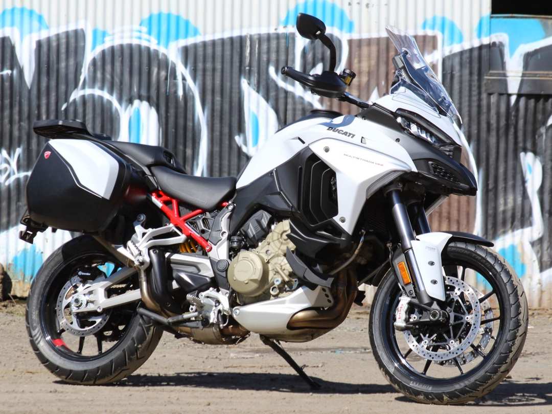 2023 Ducati Multistrada V4 S in the pretty Iceberg White color scheme with red frame, just got new tires, totally original except for an Akrapovic exhaust.
