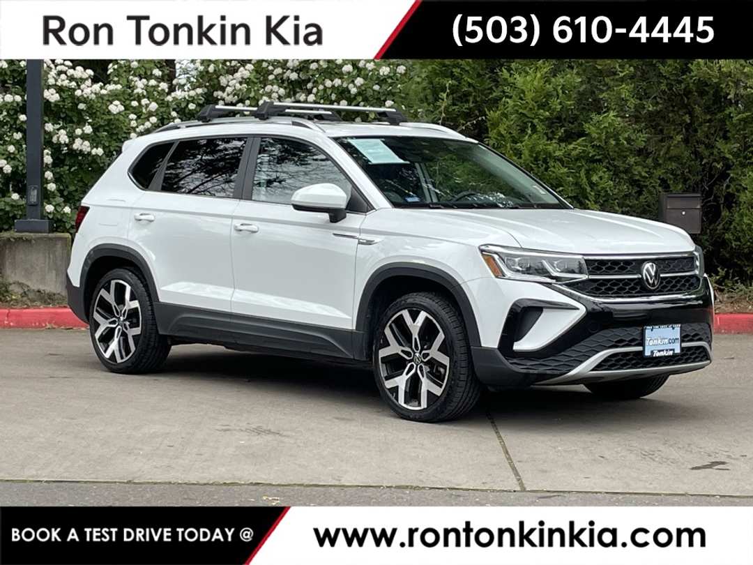 2023 Volkswagen Taos 1.5T SEL Pure White 1.5L I4 Turbocharged DOHC 16V LEV3-SULEV30 158hp 4-Wheel Disc Brakes, 5.20 Axle Ratio, 9 Speakers, ABS brakes, Active Blind Spot Monitor, Air Conditioning, Alloy wheels, AM/FM radio: SiriusXM with 360L, Auto High-beam Headlights, Auto-dimming Rear-View mirror, Automatic temperature control, Brake assist, Bumpers: body-color, Carpeted MojoMats (Set of 4), Compass, Delay-off headlights, Driver door bin, Driver vanity mirror, Dual front impact airbags, Dual front side impact airbags, Electronic Stability Control, Emergency communication system: VW Car-Net Safe & Secure 5-year, Exterior Parking Camera Rear, Four wheel independent suspension, Front anti-roll bar, Front Bucket Seats, Front Center Armrest, Front dual zone A/C, Front reading lights, Front Strut Rear Multi-Link Suspension, Fully automatic headlights, Heated & Ventilated Front Comfort Sport Seats, Heated door mirrors, Heated front seats, Heated steering wheel, Illuminated entry, Leather Shift Knob, Low tire pressure warning, Luggage Net, Navigation system: VW Car-Net Guide & Inform, Occupant sensing airbag, Outside temperature display, Overhead airbag, Overhead console, Panic alarm, Passenger door bin, Passenger vanity mirror, Perforated Vienna Leather Seating Surfaces, Power door mirrors, Power driver seat, Power moonroof, Power steering, Power windows, Radio data system, Radio: MIB3 Discover Media AM/FM/HD, Rain sensing wipers, Rear anti-roll bar, Rear Parking Sensors, Rear seat center armrest, Rear window defroster, Rear window wiper, Remote keyless entry, Security system, Speed control, Speed-sensing steering, Split folding rear seat, Spoiler, Steering wheel mounted audio controls, Tachometer, Telescoping steering wheel, Tilt steering wheel, Traction control, Trip computer, Variably intermittent wipers, Ventilated front seats, Ventilated Front Seats Credit, Wheels: 19" 2-Tone Machined Alloy.Clean CARFAX. KBB Fair Market Range High: $21,83025/32 City/Highway MPG 25/32 City/Highway MPGCome See us today and Drive! RON TONKIN KIA 19335 SE MCLOUGHLIN BLVD GLADSTONE, OR 97027.