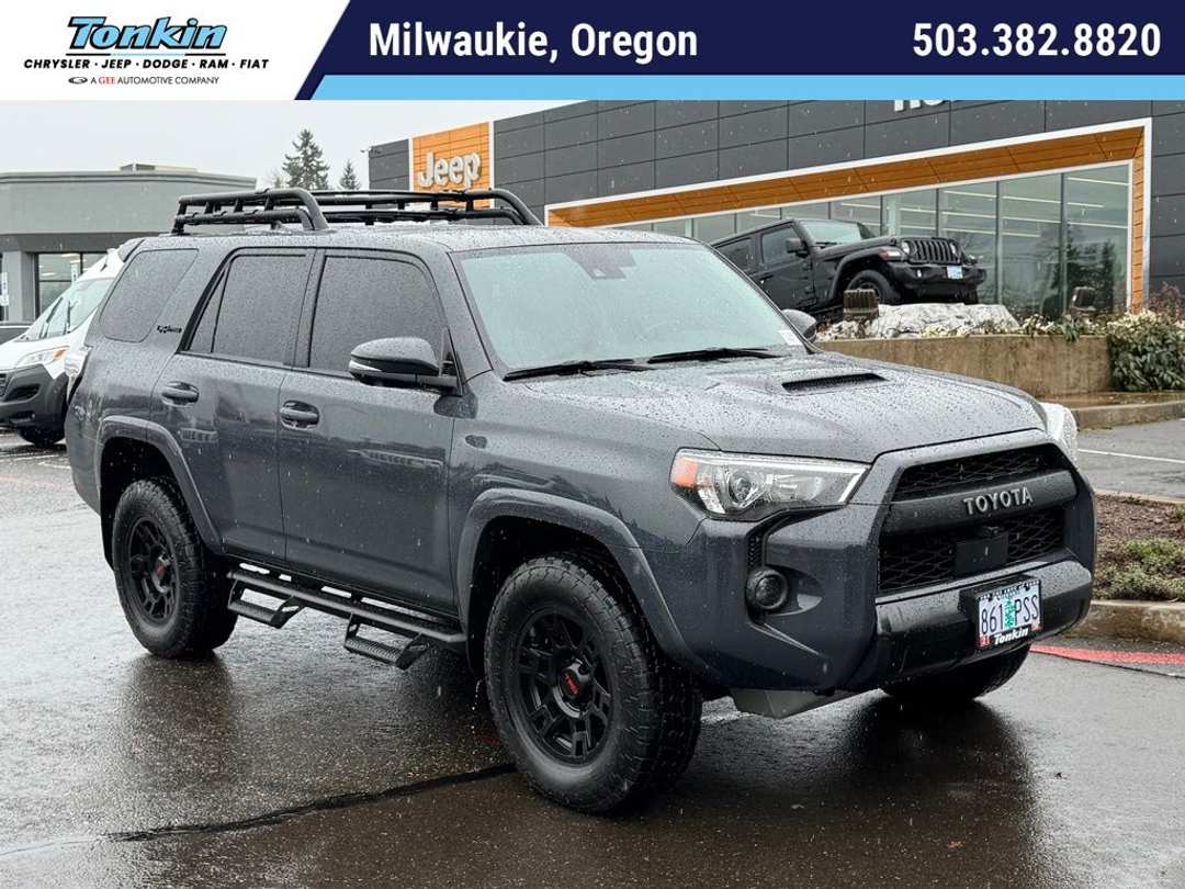 CARFAX One-Owner. Clean CARFAX. 2024 Toyota 4Runner TRD Pro 4.0L V6 DOHC 24V 5-Speed with ECT 4WD 4D Sport Utility Underground 4WD, Black/Graphite SofTex, 15 Speakers, 3.727 Axle Ratio, 4-Wheel Disc Brakes, ABS brakes, Air Conditioning, AM/FM radio: SiriusXM, Anti-whiplash front head restraints, Apple CarPlay/Android Auto, Auto High-beam Headlights, Auto-dimming Rear-View mirror, Automatic temperature control, Black Lug Nuts, Brake assist, Bumpers: body-color, Compass, Custom Fuel Wheels and Off-Road Tires, Driver door bin, Driver vanity mirror, Dual front impact airbags, Dual front side impact airbags, Dual Zone Auto Climate Control, Electronic Stability Control, Emergency communication system: Safety Connect (1-year trial), Exterior Parking Camera Rear, Fog Lights, Fox Shocks, Front anti-roll bar, Front Bucket Seats, Front Center Armrest, Front dual zone A/C, Front fog lights, Front reading lights, Front wheel independent suspension, Garage Door Opener, Garage door transmitter: HomeLink, Heated door mirrors, Heated Front Bucket Seats, Heated front seats, Heated Outside Rear-View Mirrors, Heated steering wheel, Illuminated entry, Knee airbag, Leather Shift Knob, Low tire pressure warning, Moonroof w/Tilt Up & Slide, Multi-Terrain Back Monitor, Navigation System, Occupant sensing airbag, Outside temperature display, Overhead airbag, Overhead console, Panic alarm, Passenger door bin, Passenger vanity mirror, Power door mirrors, Power driver seat, Power moonroof, Power passenger seat, Power steering, Power windows, Radio: Premium Audio w/JBL, Rear anti-roll bar, Rear seat center armrest, Rear window defroster, Rear window wiper, Remote keyless entry, Roof rack, Roof Rack, Security system, SofTex Seat Trim, Speed control, Speed-sensing steering, Split folding rear seat, Spoiler, Steering wheel mounted audio controls, Tachometer, Telescoping steering wheel, Tilt steering wheel, Traction control, TRD Pro All Weather Floor Liner, TRD Pro Badging, TRD Pro Exhaust, TRD Shift Knob, Trip computer, Variably intermittent wipers, Wheel Locks, Wheels: 17" Matte Black Flow-Formed TRD Alloy, 4WD, Black/Graphite SofTex. ***Call (503) 258-5800 to speak to a Sales Professional*** Come in to Ron Tonkin Chrysler Jeep Dodge Ram Fiat in Milwaukie to test drive today! DL0087.