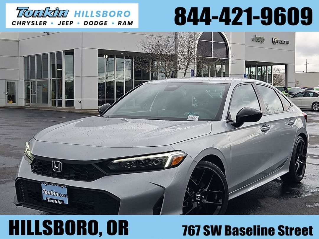 2025 Honda Civic Sport Silver FWD 2.0L I4 DOHC 16V CVTBlack Artificial Leather, 4-Wheel Disc Brakes, 8 Speakers, ABS brakes, Adaptive Cruise Control: Adaptive Cruise Control (ACC) with Low-Speed Follow, Air Conditioning, Alloy wheels, AM/FM radio, Apple CarPlay/Android Auto, Auto High-beam Headlights, Automatic temperature control, Blind Spot Information (BSI) System warning, Brake assist, Bumpers: body-color, Cloth/Leatherette Seating Surfaces, Delay-off headlights, Driver door bin, Driver vanity mirror, Dual front impact airbags, Dual front side impact airbags, Electronic Stability Control, Emergency communication system: HondaLink, Exterior Parking Camera Rear, Four wheel independent suspension, Front anti-roll bar, Front Bucket Seats, Front Center Armrest, Front reading lights, Fully automatic headlights, Heated door mirrors, Illuminated entry, Knee airbag, Leather Shift Knob, Leather steering wheel, Low tire pressure warning, Occupant sensing airbag, Outside temperature display, Overhead airbag, Panic alarm, Passenger door bin, Passenger vanity mirror, Power door mirrors, Power steering, Power windows, Radio data system, Radio: 180-Watt Audio System, Rear anti-roll bar, Rear seat center armrest, Rear side impact airbag, Rear window defroster, Remote keyless entry, Security system, Speed control, Speed-sensing steering, Split folding rear seat, Steering wheel mounted audio controls, Tachometer, Telescoping steering wheel, Tilt steering wheel, Traction control, Trip computer, Wheels: 18" Gloss Black Alloy, Black Artificial Leather.CARFAX One-Owner. Clean CARFAX.You make the drive, we'll make the deal! Come to www.tonkinhillsborocjdr.com To see our Specials!! Call us at (844) 421-9609 For help with any of our departments. The Road is Yours With Tonkin Hillsboro Chrysler Jeep Dodge Ram!!