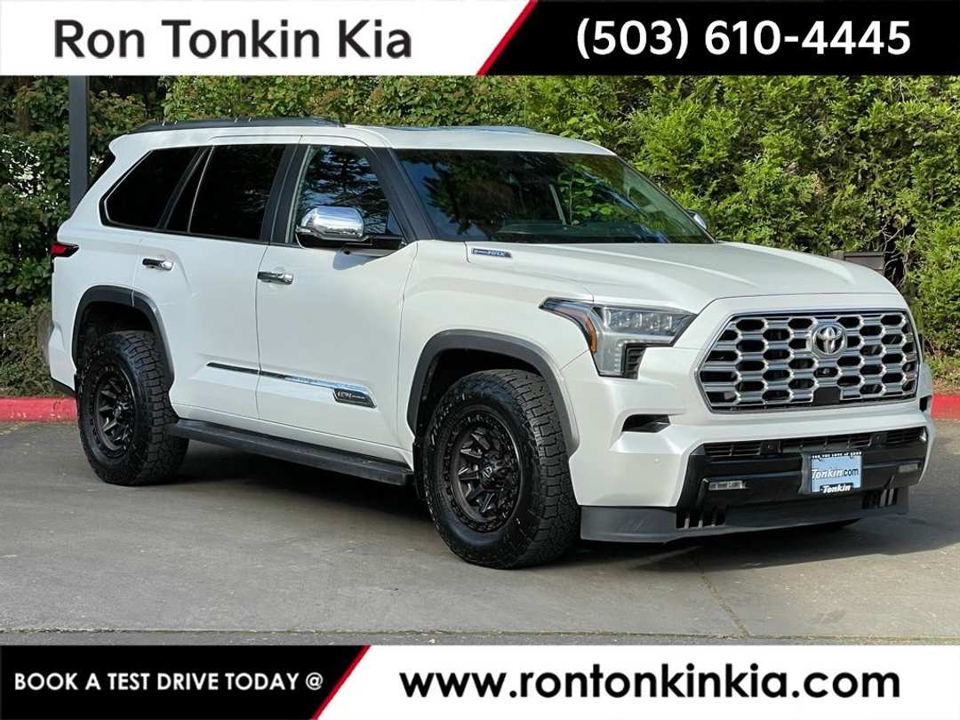 2025 Toyota Sequoia 1794 Edition V6 Hybrid 14 Speakers, 20" Alloy Wheels, 3rd row seats: split-bench, 4-Wheel Disc Brakes, ABS brakes, Air Conditioning, Alloy wheels, AM/FM radio: SiriusXM, Anti-whiplash front head restraints, Apple CarPlay/Android Auto, Auto High-beam Headlights, Auto tilt-away steering wheel, Auto-dimming door mirrors, Auto-dimming Rear-View mirror, Automatic temperature control, Brake assist, Bumpers: body-color, Compass, Delay-off headlights, Driver door bin, Driver vanity mirror, Dual front impact airbags, Dual front side impact airbags, Electronic Stability Control, Emergency communication system: Safety Connect (10-year trial), Exterior Parking Camera Rear, Front anti-roll bar, Front Bucket Seats, Front Center Armrest w/Storage, Front dual zone A/C, Front fog lights, Front reading lights, Front wheel independent suspension, Fully automatic headlights, Garage door transmitter: HomeLink, Genuine wood door panel insert, Headlight cleaning, Heated & Ventilated Front Seats, Heated door mirrors, Heated front seats, Heated rear seats, Heated steering wheel, Illuminated entry, Knee airbag, Leather Shift Knob, Leather steering wheel, Low tire pressure warning, Memory seat, Navigation system: Drive Connect (1 year trial) includes Cloud Navigation with real time traffic and Google POI, Occupant sensing airbag, Outside temperature display, Overhead airbag, Overhead console, Panic alarm, Passenger door bin, Passenger vanity mirror, Power door mirrors, Power driver seat, Power Liftgate, Power moonroof, Power passenger seat, Power steering, Power windows, Premium audio system: JBL, Premium Leather Seat Trim, Radio: 14" Toyota Audio Multimedia w/JBL Prem Aud, Rain sensing wipers, Rear air conditioning, Rear reading lights, Rear seat center armrest, Rear window defroster, Rear window wiper, Reclining 3rd row seat, Remote keyless entry, Security system, Speed control, Speed-sensing steering, Split folding rear seat, Spoiler, Sport steering wheel, Steering wheel mounted audio controls, Tachometer, Telescoping steering wheel, Tilt steering wheel, Traction control, Trip computer, Turn signal indicator mirrors, Variably intermittent wipers, Ventilated front seats, Ventilated rear seats, Voltmeter.Clean CARFAX. KBB Fair Market Range High: $71,07019/22 City/Highway MPGCome See us today and Drive! RON TONKIN KIA 19335 SE MCLOUGHLIN BLVD GLADSTONE, OR 97027.
